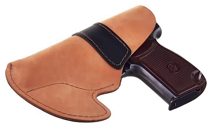 Кобура располагается в брюках и крепится через шлевки за брючный ремень.
